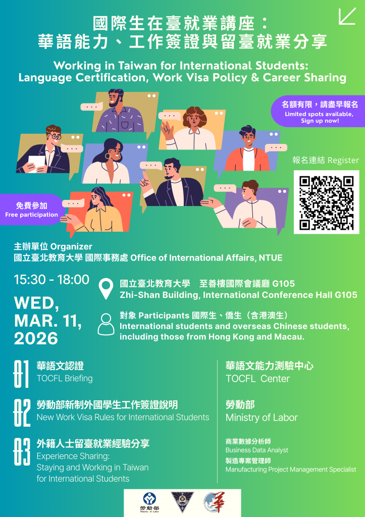 一、「Language Certification, Work Visa Policies and Career Sharing Seminar國際在臺就業講座」,旨在協助國際學生瞭解留臺就業相關制度與實務發展方向,提供語言能力認證、工作簽證政策及職涯發展之重要資訊。