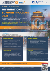 - 報名方式:請有興趣參加之同學先填寫校內活動登錄:https://forms.office.com/r/aWxtY7k0ii後自行至姊妹校報名系統填寫資料:https://forms.office.com/r/jEukJgJaWS?origin=lprLink。其餘活動相關問題,請逕洽主辦單位,Email: oia2@presidencyuniversity.in